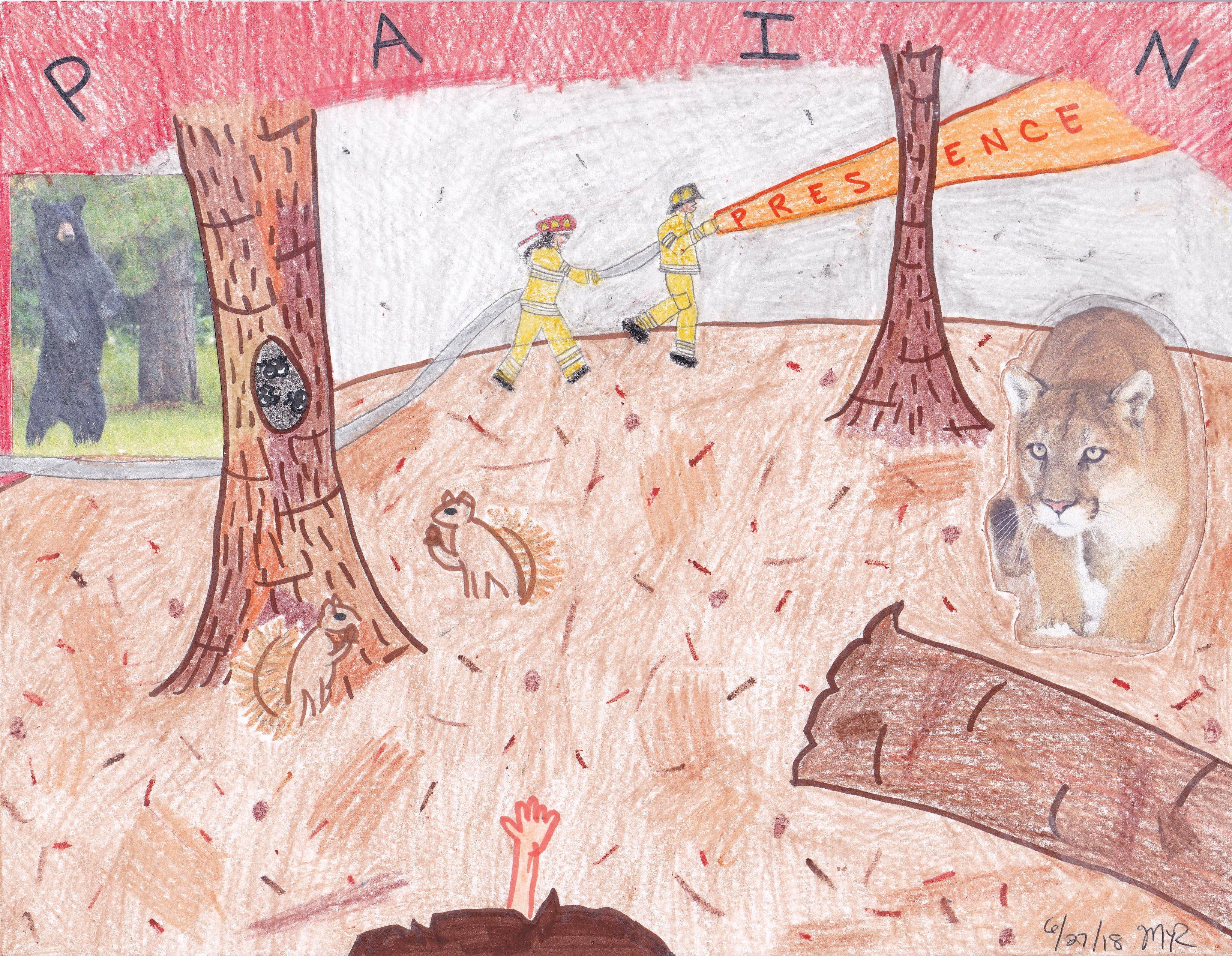 As I stared out from the log/cave (bottom center of the page), S- asked what I saw. Squirrels. There were two squirrels eating nuts at the base of a tree. There was a black bear and a mountain lion, each peaceful. The air was hazy, debris floating free. I could see the bottom of the legs of two firefighters as they ran past me in slow motion. I couldn’t hear. It was that soundless-emerging that happens after an explosion or emergency, sometimes with loud high-pitched ringing. This though was a thick lack of sound that stopped communications, put itself between me and everything else. The sound becomes the glass that separates me…