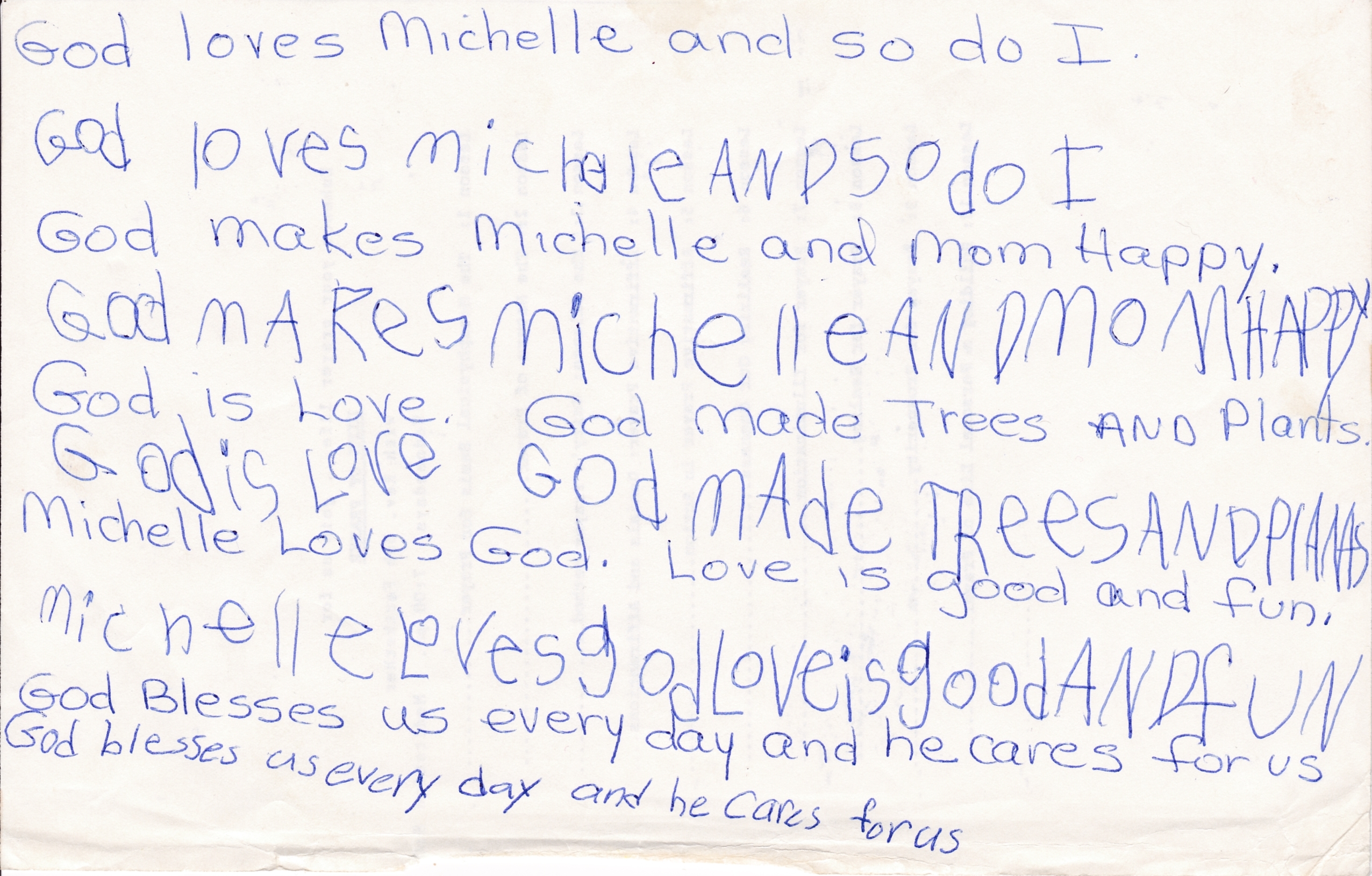 When I was really little I used to get bored in church. I was that kid that couldn’t stand children’s church when it was really daycare but had no idea what the pastor was talking about in actual church. So my mom and I would pass notes and sometimes she’d write phrases for me to copy. This is one of those phrase papers. I found it in a box of things from before I was 5. :)